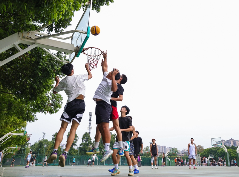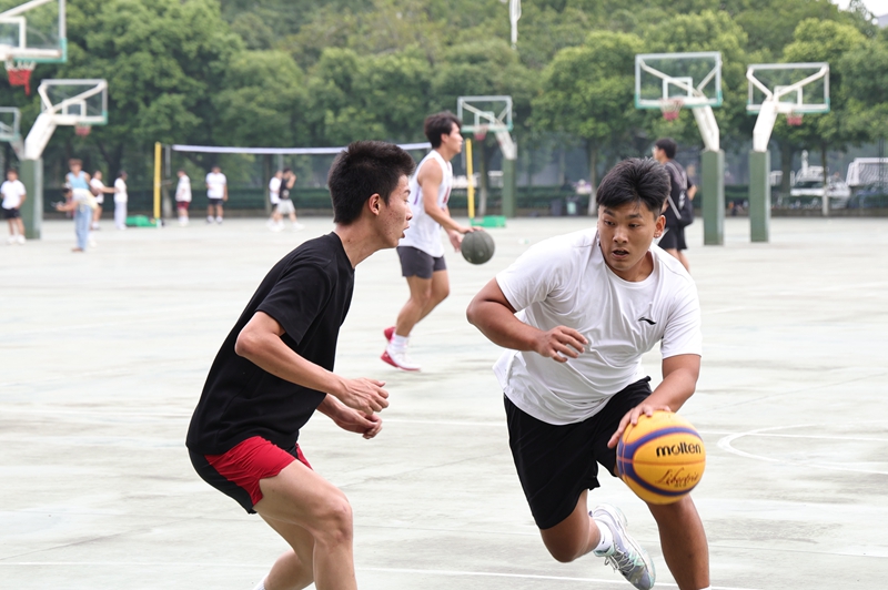 篮球场上的交流赛战况激烈。运球、突破、传球、防守,队员们默契配合,行动如风。跳投、勾手、抢断等精彩场面与精妙的战术让人目不暇接。队员们齐心协力,精准把握时机果断出手,篮球在空中划出一道道完美的弧线,引得场边阵阵欢呼。体育学院谢相和院长表示:“本次比赛旨在以赛促练,为高水平赛事选拔储备人才,营造蓬勃向上的运动氛围。”