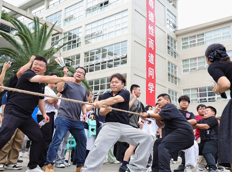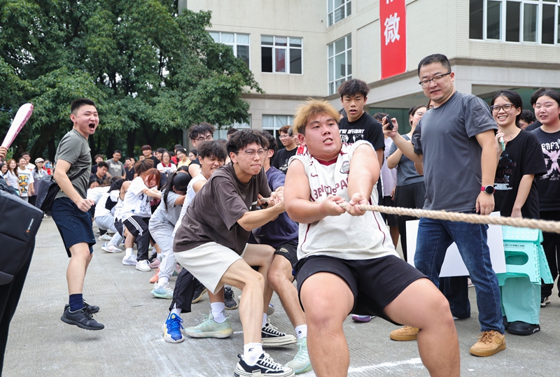 第五教学楼前的拔河赛场气氛最为热烈。一场汇聚了全校12个学院新生力量的较量正如火如荼进行。“3、2、1——预备——开始!”裁判的哨声划破天际,粗壮的拔河绳瞬间绷紧如弦。参赛同学们个个扎稳马步、身体后仰,将全身力量灌注于双掌与后倾的身躯。那根决定胜负的界绳,在中线两侧反复拉锯,每一厘米的位移都紧紧牵动着观众的心弦,加油声、呐喊声震耳欲聋。经过多轮紧张激烈的角逐,艺术学院代表队突出重围,勇夺桂冠。