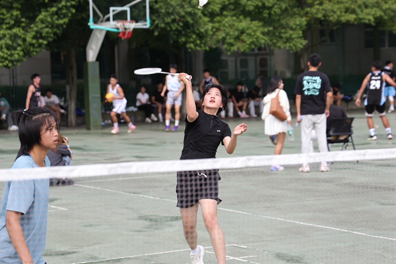 羽毛球场上同样是热火朝天的景象。选手们目光如炬,紧盯着空中飞舞的白色羽球,脚步灵活移动。他们时而网前轻挑放小球,时而后场跃起大力扣杀,将力量与技巧完美结合。羽球在空中飞速穿梭,划出清脆的击球声。数字经济学院经济学专业刘静同学激动地说:“现场洋溢的青春活力深深点燃了我的热情,接下来我要积极投身到丰富的校园活动中!”